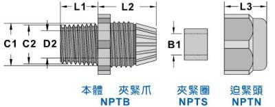 材質: UL合格之NYLON 66(黑色)防火等級 94V-2,絕緣佳,不易老化,夾緊圈為耐油橡膠材質。 用途: 可廣泛應用於各種配電盤、機械控制箱、數位顯示板、自動控制配電盤、電氣設備、太陽能發電系統配線、電信及網路通訊、監視系統、視聽音響、LED照明設備、交通號誌、事務儀器等電器製品的電線電纜固定之用。 用法: 先將本體直接鎖入,再將電線套入夾緊圈,最後以迫緊頭將其迫緊固定,並達到防水、防塵之功能。 特點: 1. 本體與夾緊爪一體成型,裝配省時、便利。 2. 本產品之迫緊頭採外迫方式迫緊,徒手操作即可牢牢夾緊,省力、簡捷。 3. IP68防塵、防水測試合格(需加墊片)。 ※ 若分開訂購各零件時,請在型號後面加上各代號:本體(B) 夾緊圈(S) 迫緊頭(N)例:訂購NPT-14本體,型號為NPTB-14。