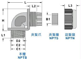 材質: UL合格之NYLON 66(黑色)防火等級 94V-2,絕緣佳,不易老化,夾緊圈為耐油橡膠材質。 用途: 可廣泛應用於各種配電盤、機械控制箱、數位顯示板、自動控制配電盤、電氣設備、太陽能發電系統配線、電信及網路通訊、監視系統、視聽音響、LED照明設備、交通號誌、事務儀器等電器製品的電線電纜固定之用。 用法: 先將本體直接鎖入,再將電線套入夾緊圈,最後以迫緊頭將其迫緊固定,並達到防水、防塵之功能。 特點: 1. 本體與夾緊爪一體成型,裝配省時、便利。 2. 本產品之迫緊頭採外迫方式迫緊,徒手操作即可牢牢夾緊,省力、簡捷。 3. IP68防塵、防水測試合格(需加墊片)。 4. 本產品之直角造型適用於彎角環境。 ※ 若分開訂購各零件時,請在型號後面加上各代號:螺帽(L) 墊片(W) 本體(B) 夾緊圈(S) 迫緊頭(N)例:訂購NPTA-38本體,型號為NPTAB-38。