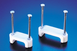 材質: 採PE(白色)射出成型彈性大、耐衝擊。 特點: 1.本系列固定夾,均為插釘式,鋼釘直接附著於塑膠座上,可大量節省工時,降低施工成本。 2.雙釘式設計增強附著力,堅固不脫落。 3.本產品適用於大型扁線固定用。