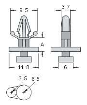 材質: UL合格之NYLON 66(本色),防火等級 94V-2。 用途: 固定PC板,拆卸容易。 用法: 先將基板鑽如圖所示之底孔,將隔離柱由大孔處放入再推入小孔即可固定。