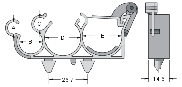 点击放大 产品名称: 分線型夾線套 产品型号: TWS-3 产品简介: 详细说明 1204 KSS 分線型夾線套 Wire Saddle 材質: UL合格之NYLON 66(本色),防火等級 94V-2。 單位:mm 型 號 Item No. 尺寸 Dimension 包 裝 Packing A B C D E TWS-3 8.4 16.3 8.8 24.8 27.0 100 pcs / 包