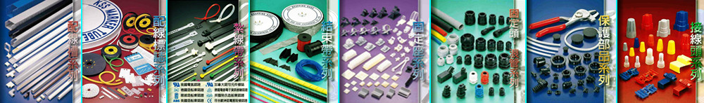 本公司專業產品有絕緣配線槽、配線標誌、紮線帶、結束帶、配線固定座、固定頭、浪管、金屬軟管、絕緣保護套、電源線扣、扣式塞頭、護線環、護蓋、閉端端子、端子台、接線頭、套管、電纜固定夾、尼龍鉚釘、LED座、PC板隔離柱、膨脹管、PC板導槽、PC板護線套、PC板焊接端子、接線端子、接地片、墊片、腳墊、塑膠螺絲、電子塑膠零件與配線器材用工具等;其产品并通过ROHS、UL、CE、VDE、CSA、TUV、NEMEO、SEMKO、FIMKO等欧美国家之安全标准认证。