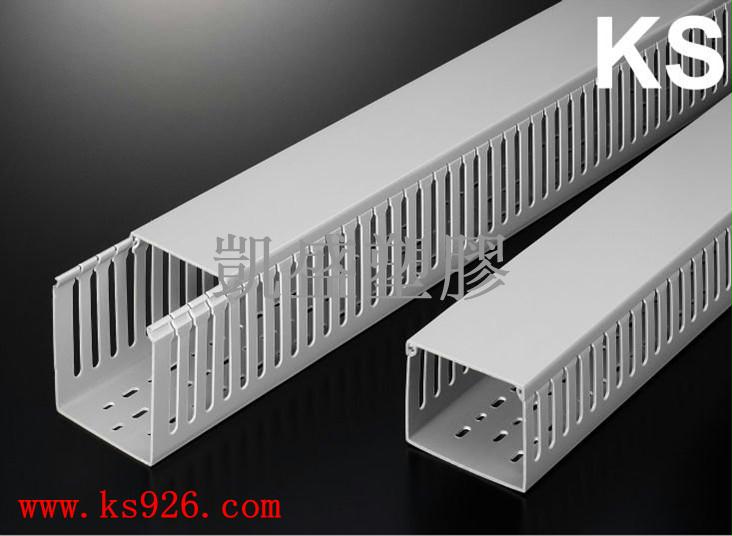 材質: 採用UL合格之南亞PVC(灰色)製成,通過美規94V-0防火等級,歐規M1防火等級,耐燃性佳,絕緣性良好,不自燃,耐溫至85℃。 構造: 由槽底及槽蓋兩部份組成,槽底兩側設出線孔,以組合後外部之寬、高為規格標準,UL測試溫度50℃。 特點: 1. 配線槽底座兩側出線孔互相對齊,任何處鋸斷或接成 L 型均可保持盤面美觀、整齊。 2. 槽蓋經特殊設計,與配線槽底座組合後絕不脫落,且接合面平滑,不割傷手及擦損附近配線。 3. 出線孔低、組合容易、拆卸簡單,易於配線。
