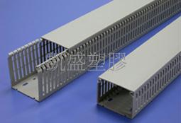材質: 採用UL合格之南亞PVC(灰色)製成,通過美規94V-0防火等級,歐規M1防火等級,耐燃性佳,絕緣性良好,不自燃,耐溫至85℃。膠層為PE共聚合物 (PE copolymer)。 構造: 由槽底及槽蓋兩部份組成,底槽兩側設出線孔,出線孔4.5mm,以組合後外部之寬、高為規格標準,每側設有一條刀割式折痕。UL測試溫度50℃。 特點: 1. 兩側出線孔之凸點設計,可在同一出線孔做分層區隔使用。 2. 槽底兩側均有一條刀割式折痕線設計,可依安裝者需求,折出需要的側孔大小。 3. 於配線槽上蓋掛勾之內面設有「特殊止滑膠層」,能有效增加澀度及黏度,使線槽與上蓋密合,防止上蓋滑動、脫落,更利垂直上下佈線作業,提昇施工效率。