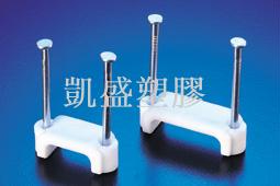 材質: 採PE(白色)射出成型彈性大、耐衝擊。 特點: 1.本系列固定夾,均為插釘式,鋼釘直接附著於塑膠座上,可大量節省工時,降低施工成本。 2.雙釘式設計增強附著力,堅固不脫落。 3.本產品適用於大型扁線固定用。