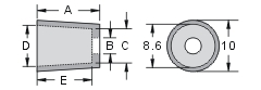 点击放大 产品名称: 圓錐體墊片 产品型号: CDW-12 产品简介: 详细说明 1308 KSS 圓錐體墊片 Conoid Washer 材質: UL合格之 NYLON 66(本色),防火等級 94V-2。 單位:mm 型 號 Item No. A B C D E 包 裝 Packing CDW-12 12.2 3.3 6.9 8.3 10.7 100 pcs / 包